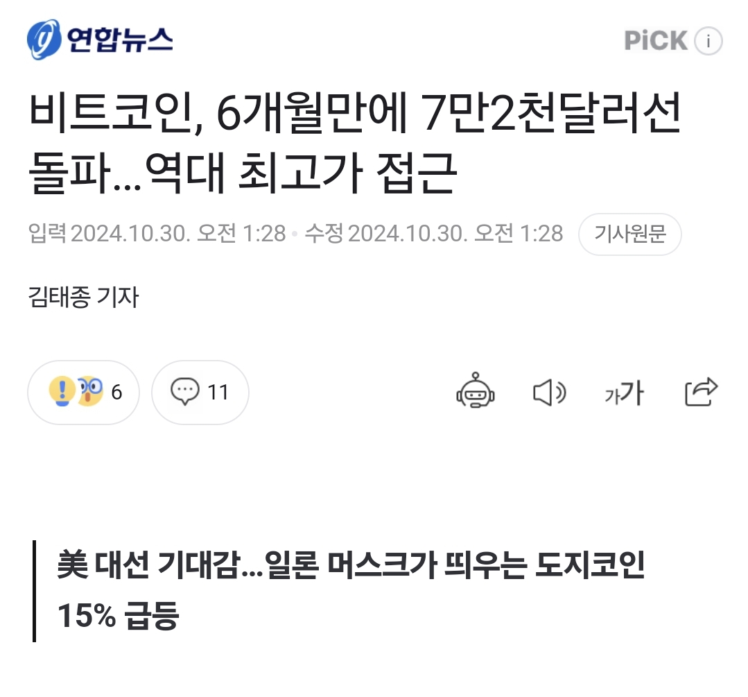 비트코인, 6개월 만에 7만 2천 달러선 돌파, 역대 최고가 접근이란 기사가 있네요.
