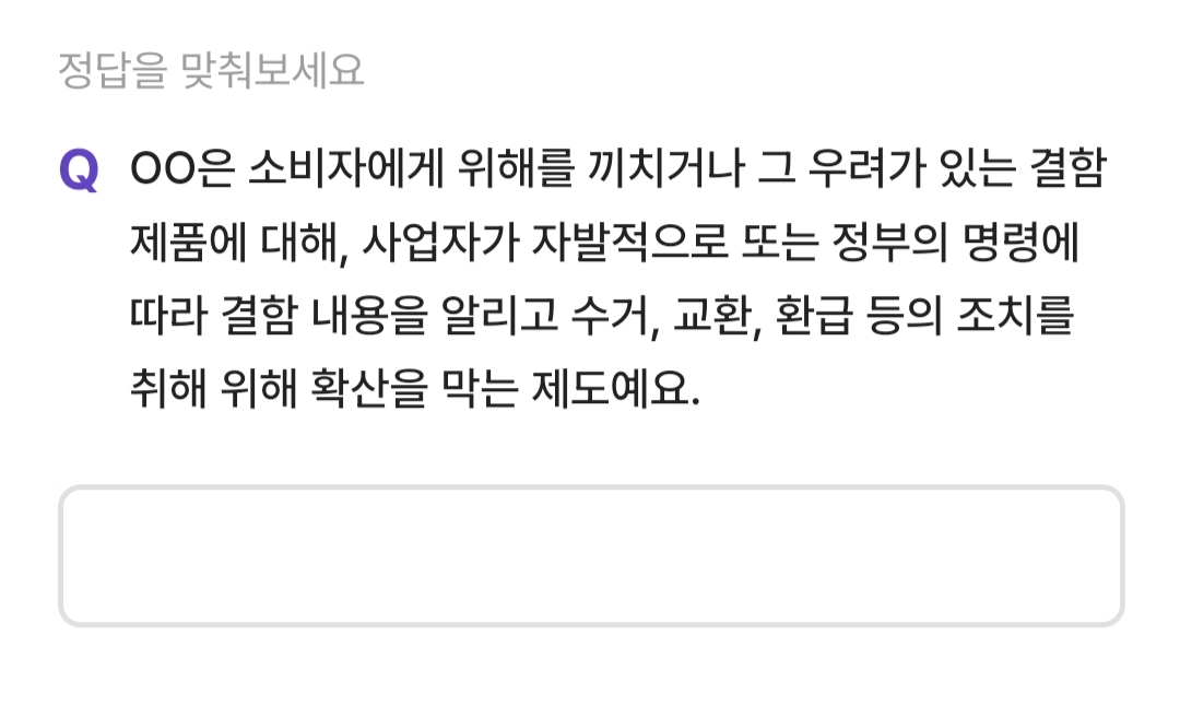 문제는 소비자에게 위해를 끼치거나 그 우려가 있는 결함 제품에 대해 사업자가 자발적으로 또는 정부의 명령에 따라 결함 내용을 알리고 수거, 교환, 환급 등의 조치를 취하여 위해가 확산되는 걸 막는 제도입니다,