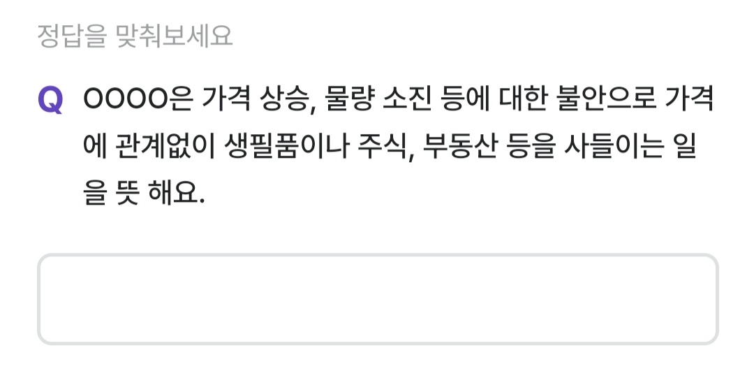 가격 상승, 물량 소진 등에 대한 불안으로 가격에 관계없이 생필품이나 주식, 부동산 등을 사들이는 일을 뜻합니다.