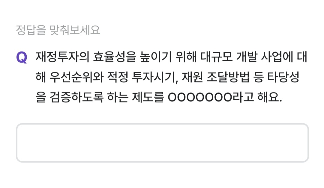 재정투자의 효율성을 높이기 위해 대규모 개발 사업에 대해 우선순위와 적정 투자시기, 재원 조달방법 등 타당성을 검증하도록 하는 제도를 무엇이라고 할까요?