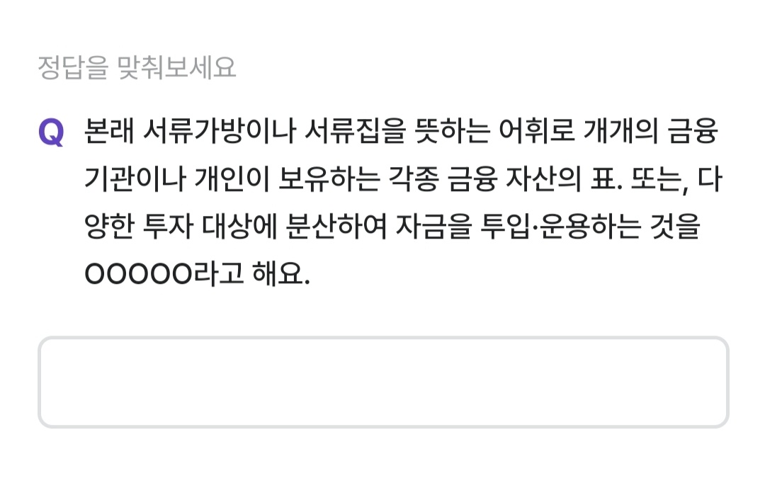 본래 서류가방이나 서류집을 뜻하는 어휘로 개개의 금융기관이나 개인이 보유하는 각종 금융 자산의 표, 또는 다양한 투자 대상에 분산하여 자금을 투입, 운용하는 것을 무엇이라고 할까요