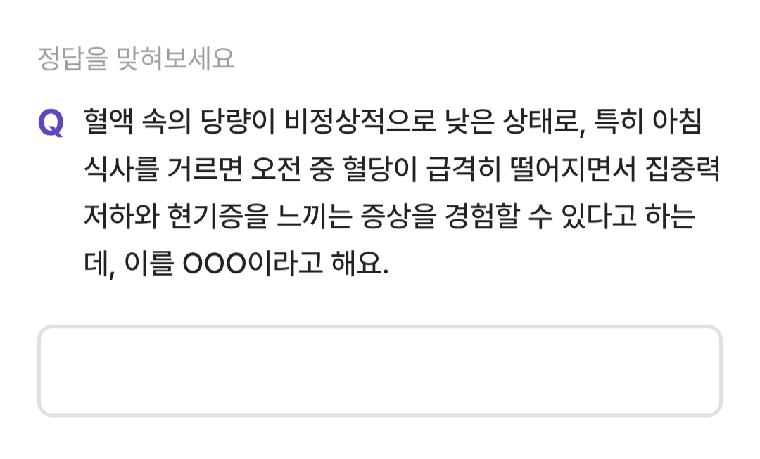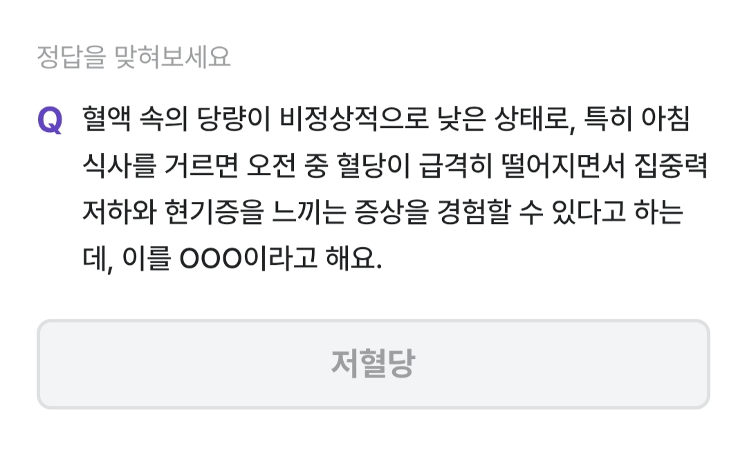 혈액 속의 당량이 비정상적으로 낮은 상태로, 특히 아침 식사를 거르면 오전 중 혈당이 급격히 떨어지면서 집중력 저하와 현기증을 느끼는 증상을 경험할 수 있다고 하는데 이를 무엇이라고 할까요?