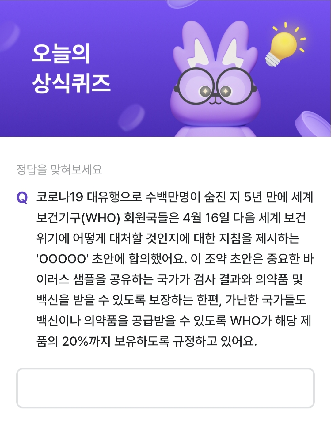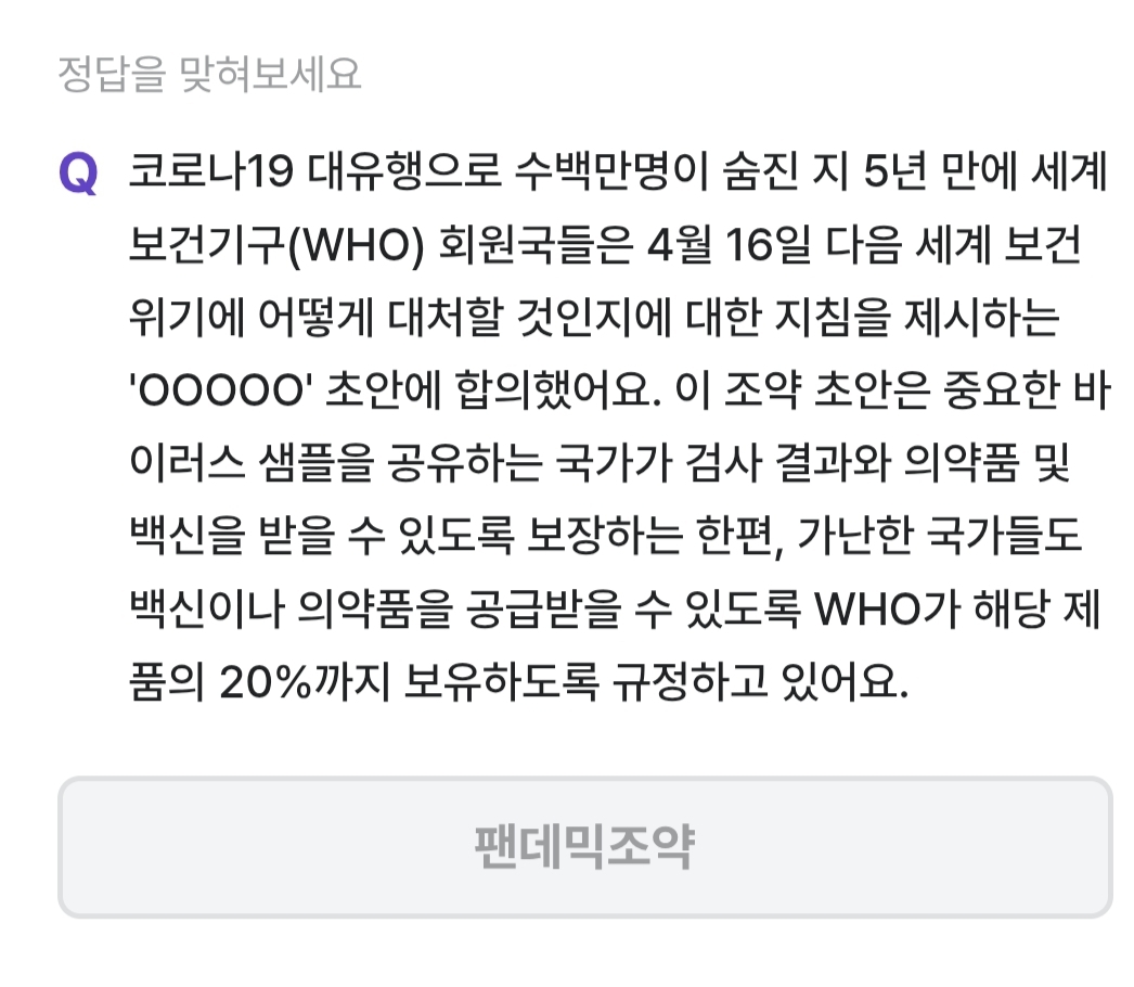 4월 28일 퀴즈 문제는 코로나19 대유행으로 수백만 명이 숨진 지 5년 만에 세계보건기구(WHO) 회원국들은 4월 16일 다음 세계 보건위기에 어떻게 대처할 것인지에 대한 지침을 제시하는 이 초안에 합의했습니다. 이 조약 초안은 중요한 바이러스 샘플을 공유하는 국가가 검사 결과와 의약품 및 백신을 받을 수 있도록 보장하는 한편, 가난한 국가들도 백신이나 의약품을 공급받을 수 있도록 WHO가 해당 제품의 20%까지 보유하도록 규정하고 있습니다.