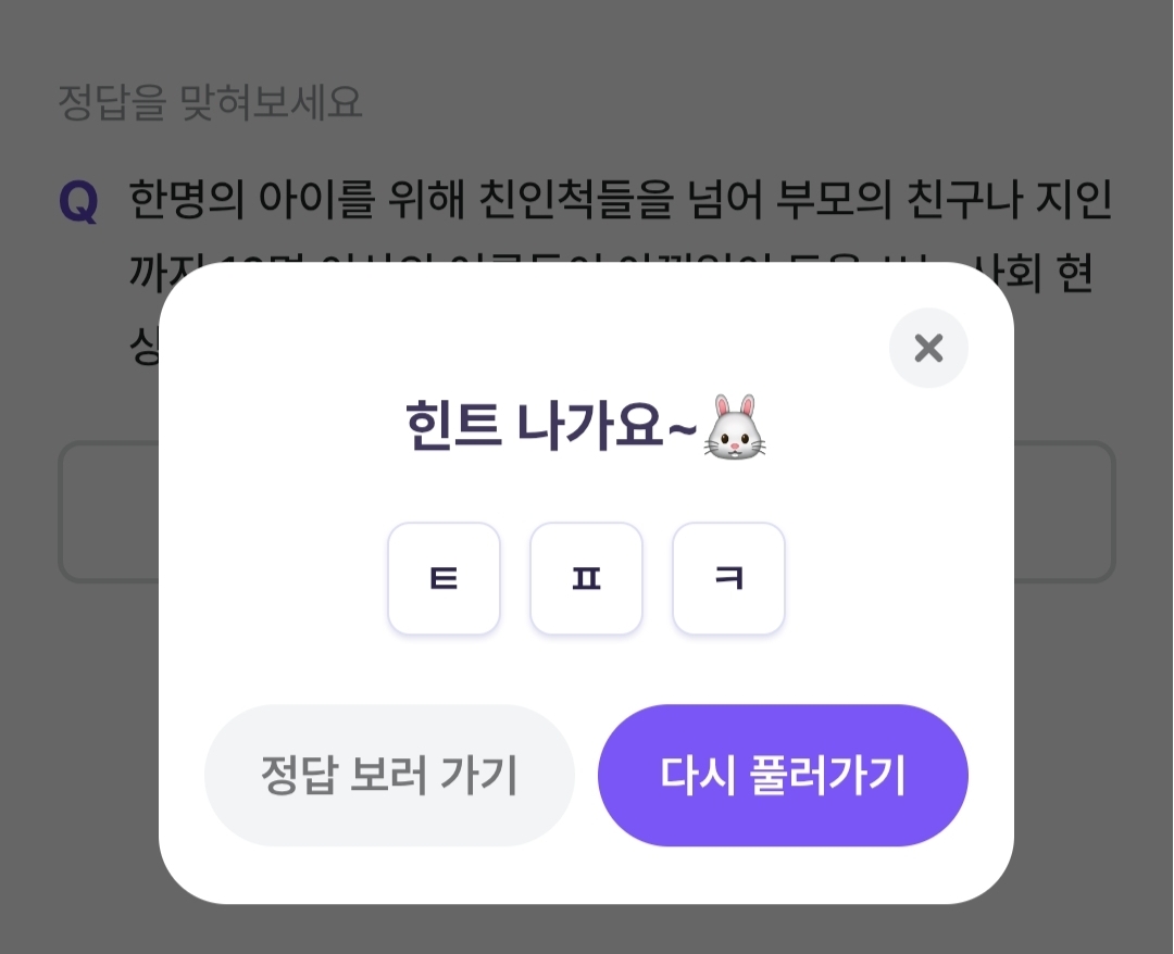 세글자이며 초성힌트는 ㅌㅍㅋ입니다.
