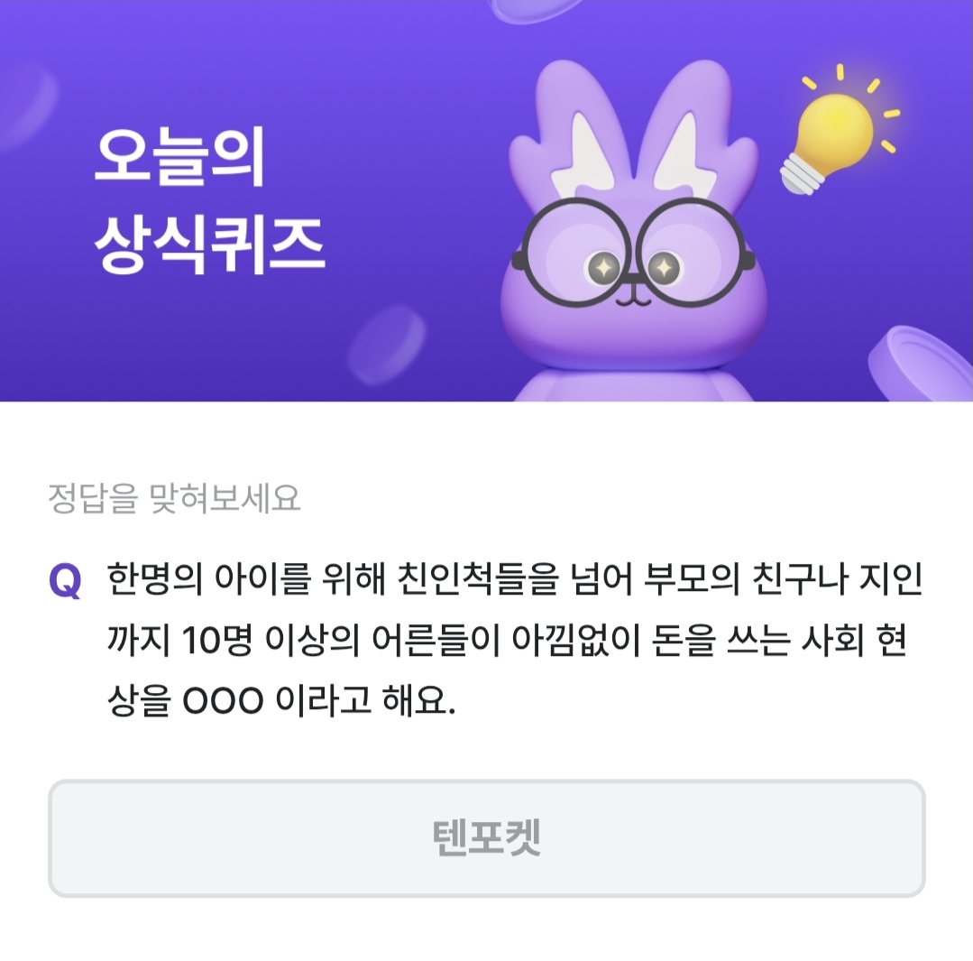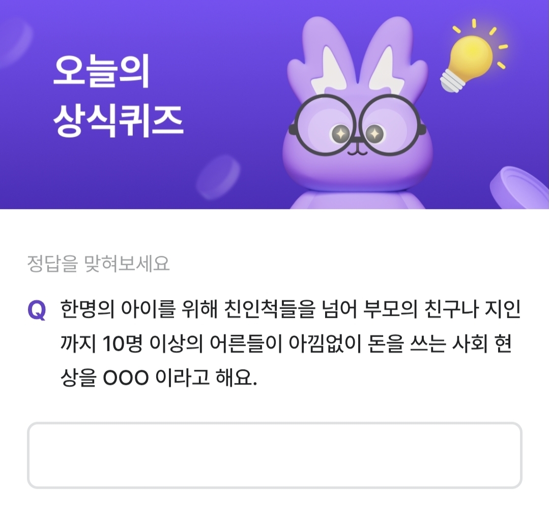 비트버니 퀴즈 5월 14일 문제는 한명의 아이를 위해 친인척들을 넘어 부모의 친구나 지인까지 10명 이상의 어른들이 아낌없이 돈을 쓰는 사회 현상을 무엇이라고 할까요?