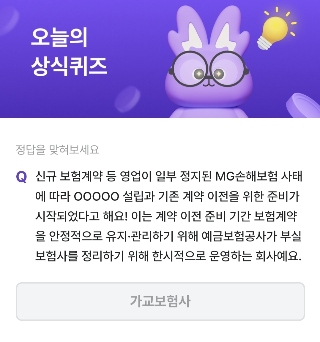 5월 21일 비트버니 퀴즈 문제는 신규 보험계약 등 영업이 일부 정지된 MG손해보험 사태에 따라 이 회사가 설립되고 기존 계약 이전을 위한 준비가 시작되었다고 합니다. 이는 계약 이전 준비 기간 보험계약을 안정적으로 유지, 관리하기 위해 예금보험공사가 부실 보험사를 정리하기 위해 한시적으로 운영하는 회사입니다.