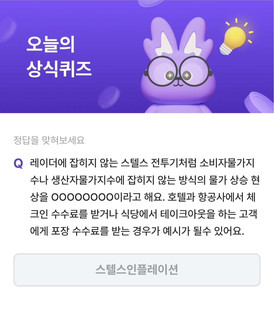 레이더에 잡히지 않는 스텔스 전투기처럼 소비자물가지수나 생산자물가지수에 잡히지 않는 방식의 물가 상승 현상을 무엇이라고 할까요? 호텔과 항공사에서 체크인 수수료를 받거나 식당에서 테이크아웃을 하는 고객에게 포장 수수료를 받는 경우가 예시가 될 수 있습니다.