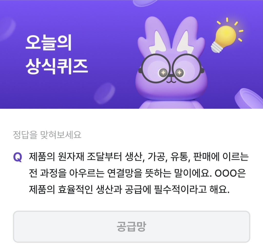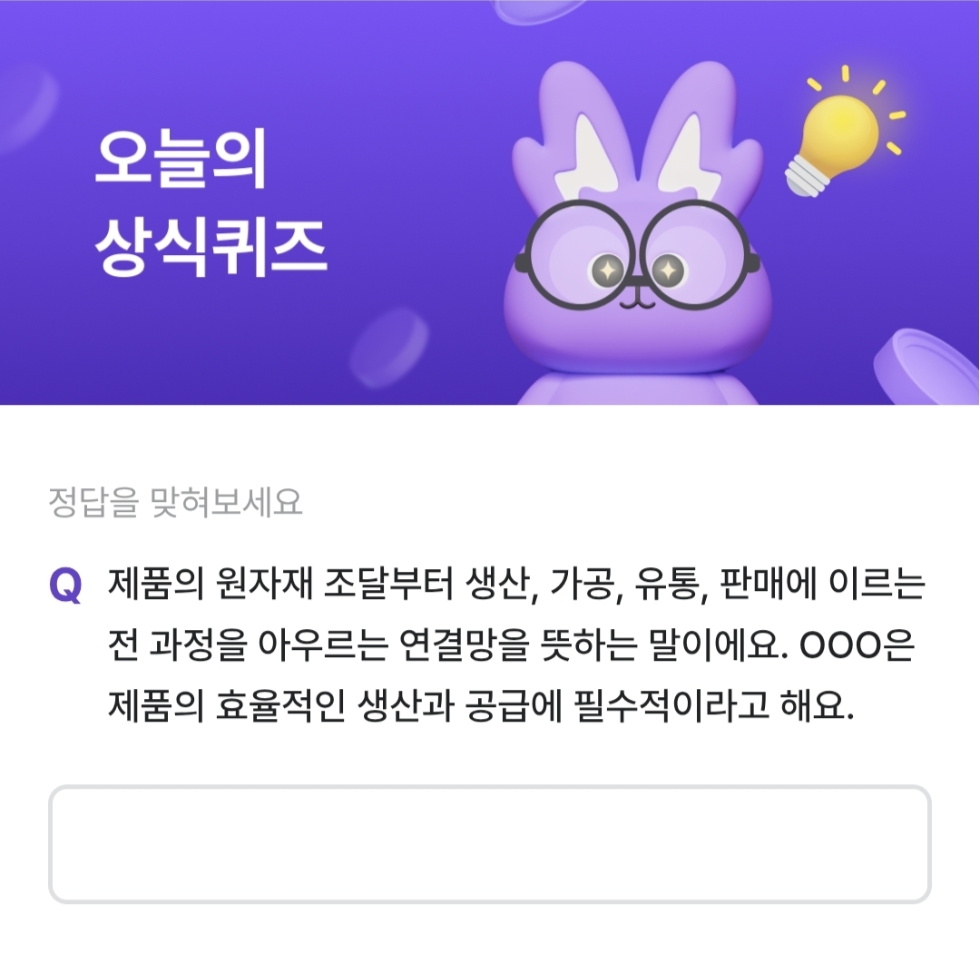 비트버니 퀴즈 8월 1일 문제는 제품의 원자재 조달부터 생산, 가공, 유통, 판매에 이르는 전 과정을 아우르는 연결망을 뜻하는 말입니다. 제품의 효율적인 생산과 공급에 필수적이라고 합니다.