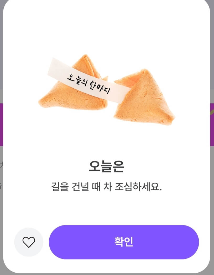 오늘은 길을 건널 때 차 조심하세요.라고 말해주네요. 이런 말을 들으면 불안하다고 생각이 들 수 있지만 늘 조심하고 있는 건데 생각하고 오늘은 더 기본을 지키며 다녀야겠습니다.