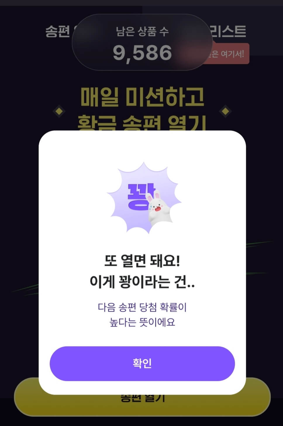 매일 미션 수행하고 황금송편을 열 수 있는 이벤트가 있는데요. 저는 오늘은 두 개 다 꽝이었네요. 9월 18일까지 송편을 모아서 선물에 응모를 할 수 있는 이벤트라 부담 없이 해보셔도 좋겠습니다. 금 1돈 되시는 분들 궁금해지네요. 매일 30명 황금올리브반마리와 콜라, 100명에게는 황금보리 1병, 매일 1만 명에게는 10 코인을 준다고 합니다.