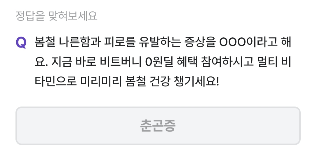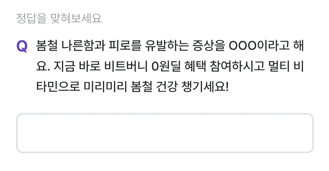 봄철 나른함과 피로를 유발하는 증상을 무엇이라고 할까요? 지금 바로 비트 버니 0 원딜 혜택 참여하시고 멀티 비타민으로 미리미리 봄철 건강 챙기세요!
