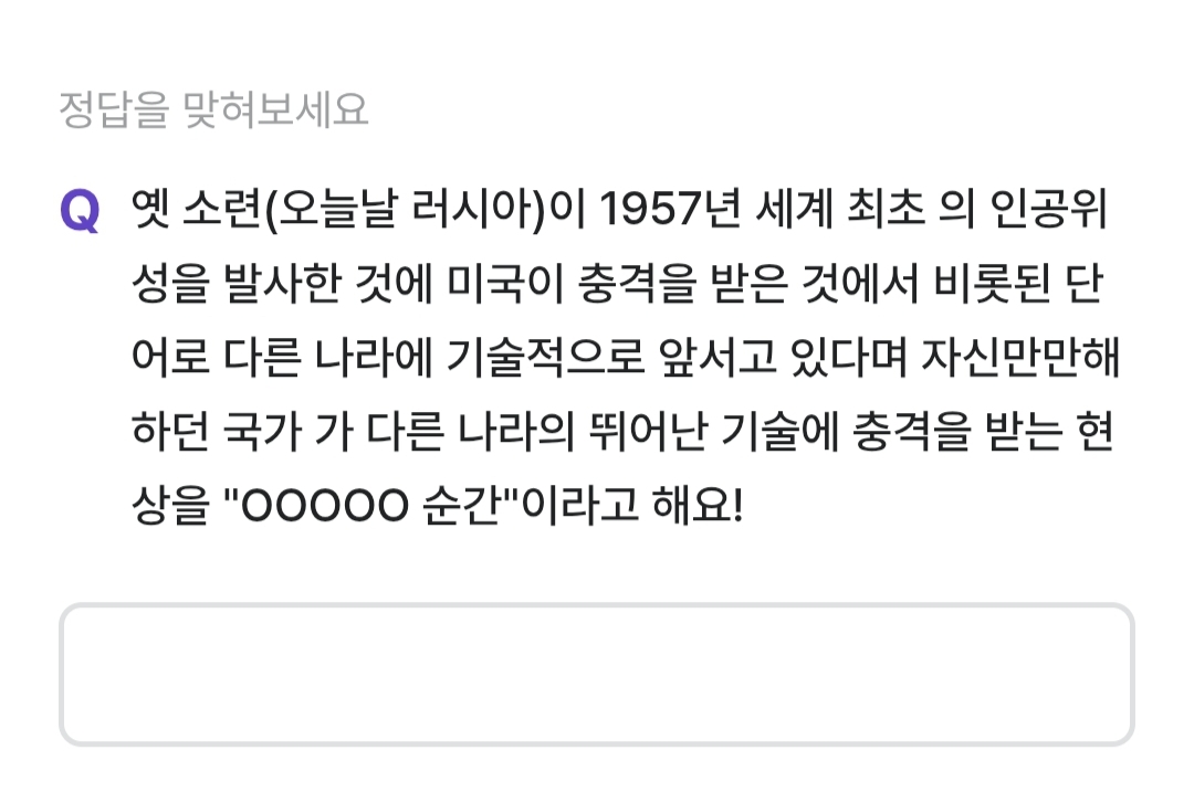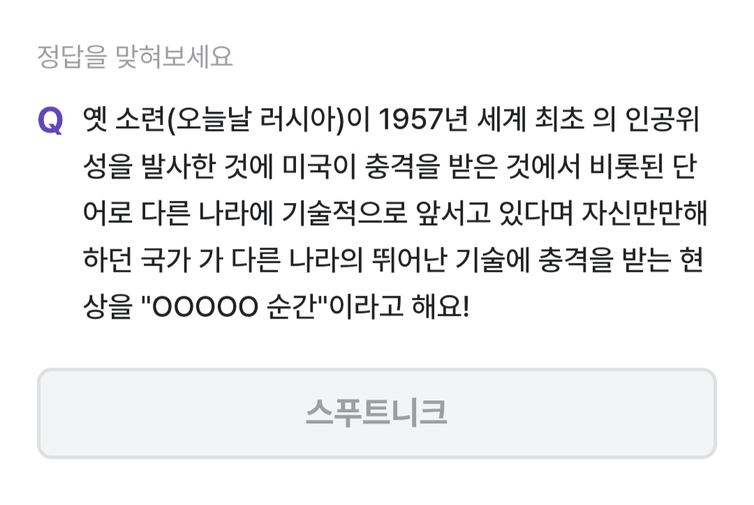 옛 소련 오늘날 러시아가 1957년 세계최초의 인공위성을 발사한 것에 미국이 충격을 받은것에서 비롯된 단어로 다른 나라에 기술적으로 앞서고 있다며 자신만만해하던 국가가 다른 나라의 뛰어난 기술에 충격을 받는 현상을 무엇이라고 할까요?
