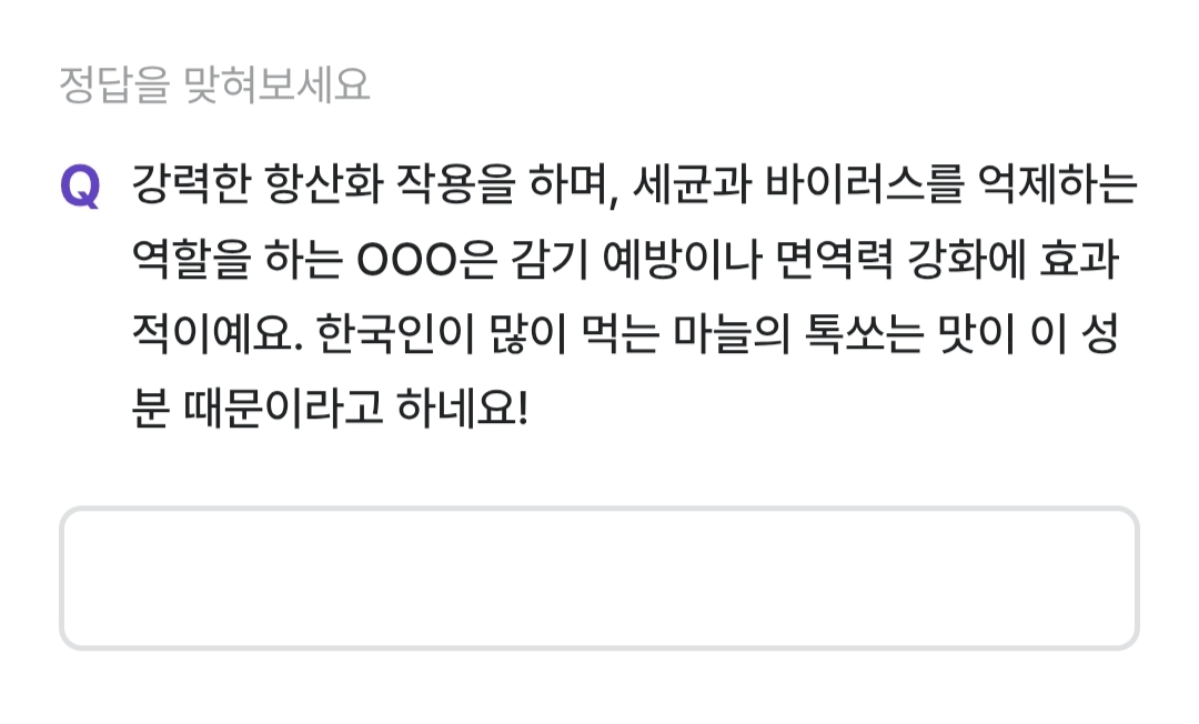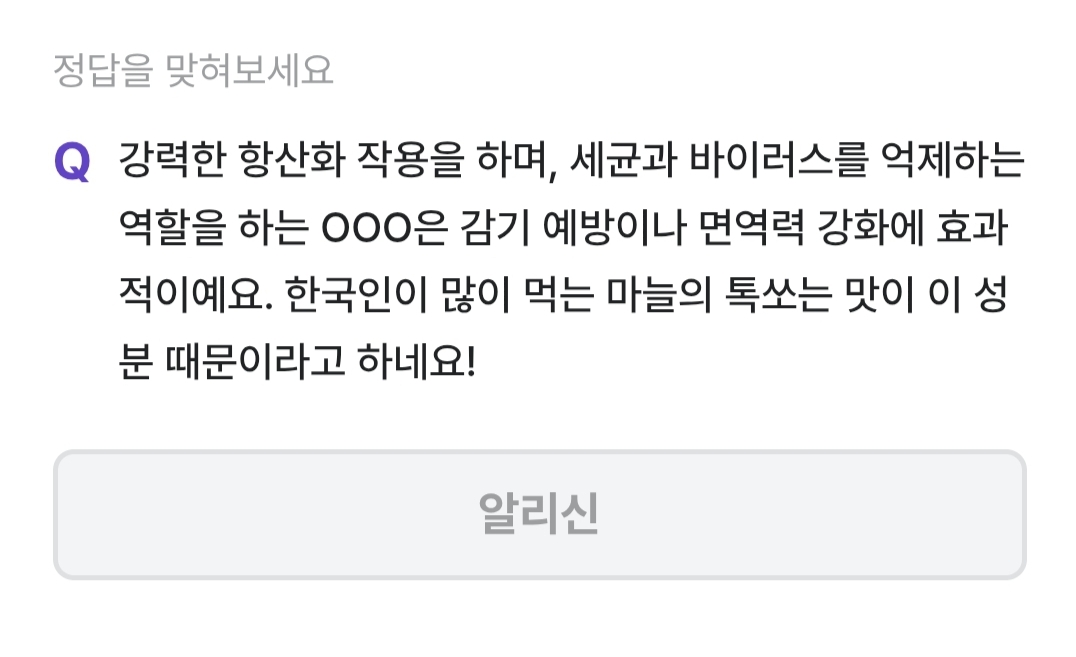 비트버니 퀴즈를 통해 알리신에 대해 알아봤고 마늘을 먹을 때 생각하며 먹는다면 몸에 더 좋을 것 같습니다.