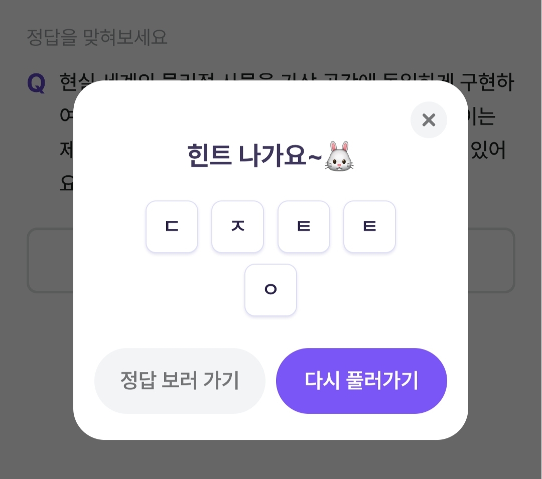 정답은 다섯글자로 초성힌트는 ㄷㅈㅌㅌㅇ입니다.