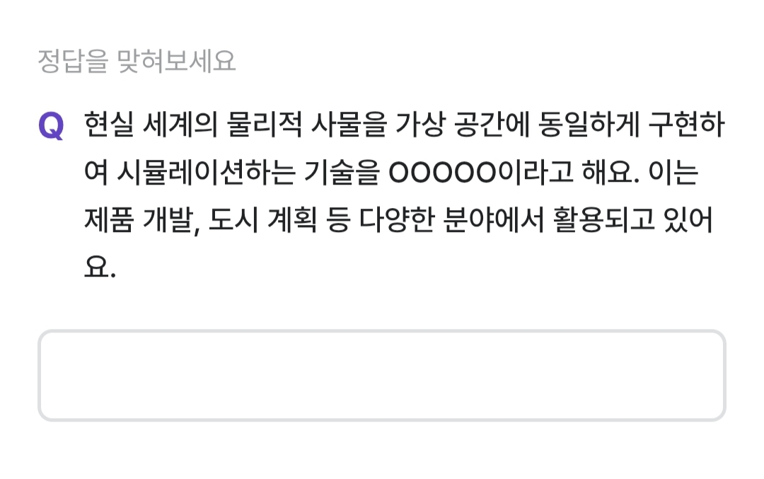 현실 세계의 물리적 사물을 가상 공간에 동일하게 구현하여 시뮬레이션하는 기술을 무엇이라고 할까요? 이는 제품 개발, 도시 계획 등 다양한 분야에서 활용되고 있습니다.