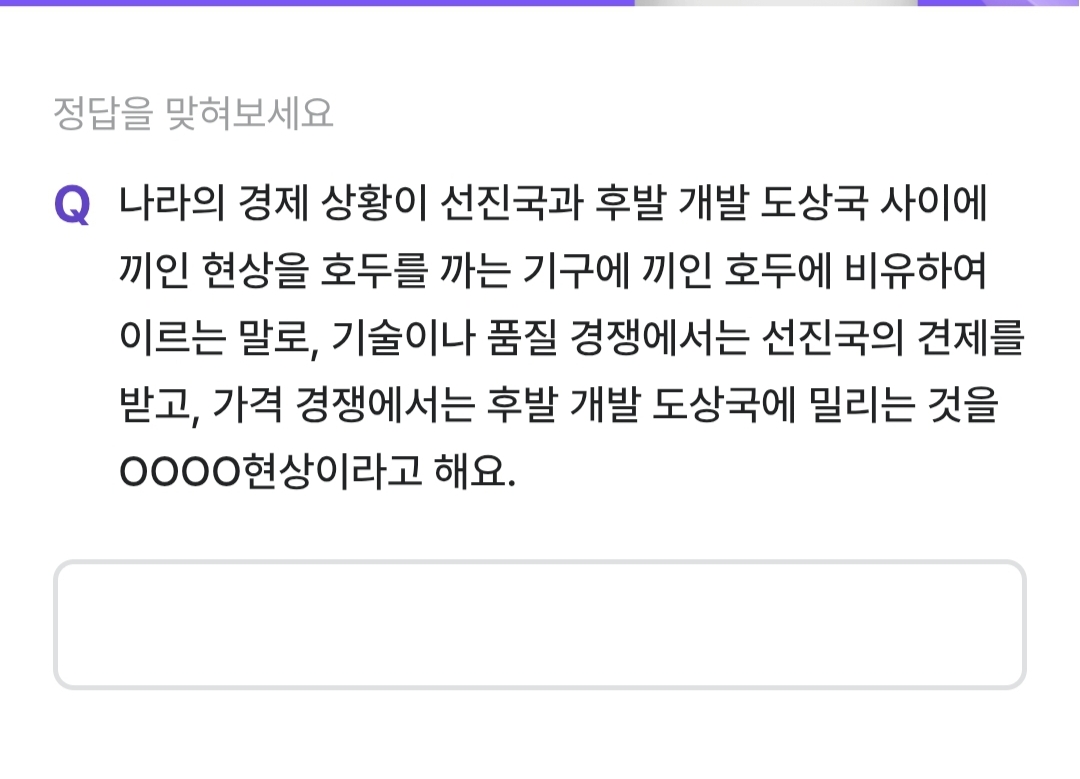 나라의 경제상황이 선진국과 후발 개발 도상국 사이에 끼인 현상을 호두를 까는 기구에 끼인 호두에 비유하여 이르는 말로, 기술이나 품질 경쟁에서는 선진국의 견제를 받고, 가격 경쟁에서는 후발 개발 도상국에 밀리는 것을 무슨 현상이라고 할까요?
