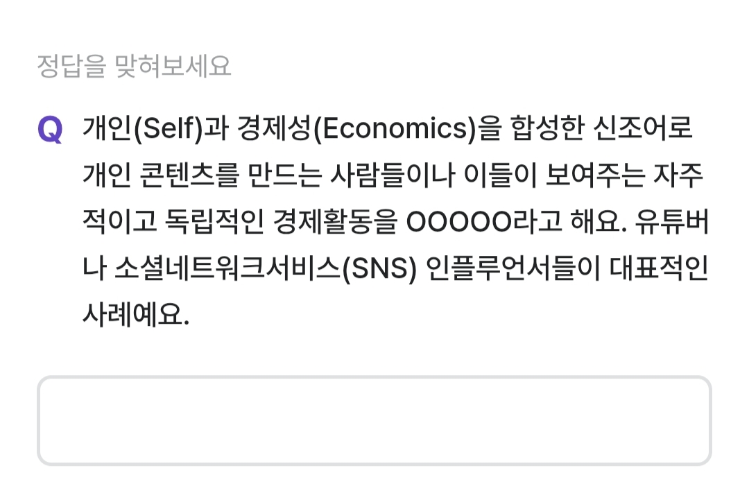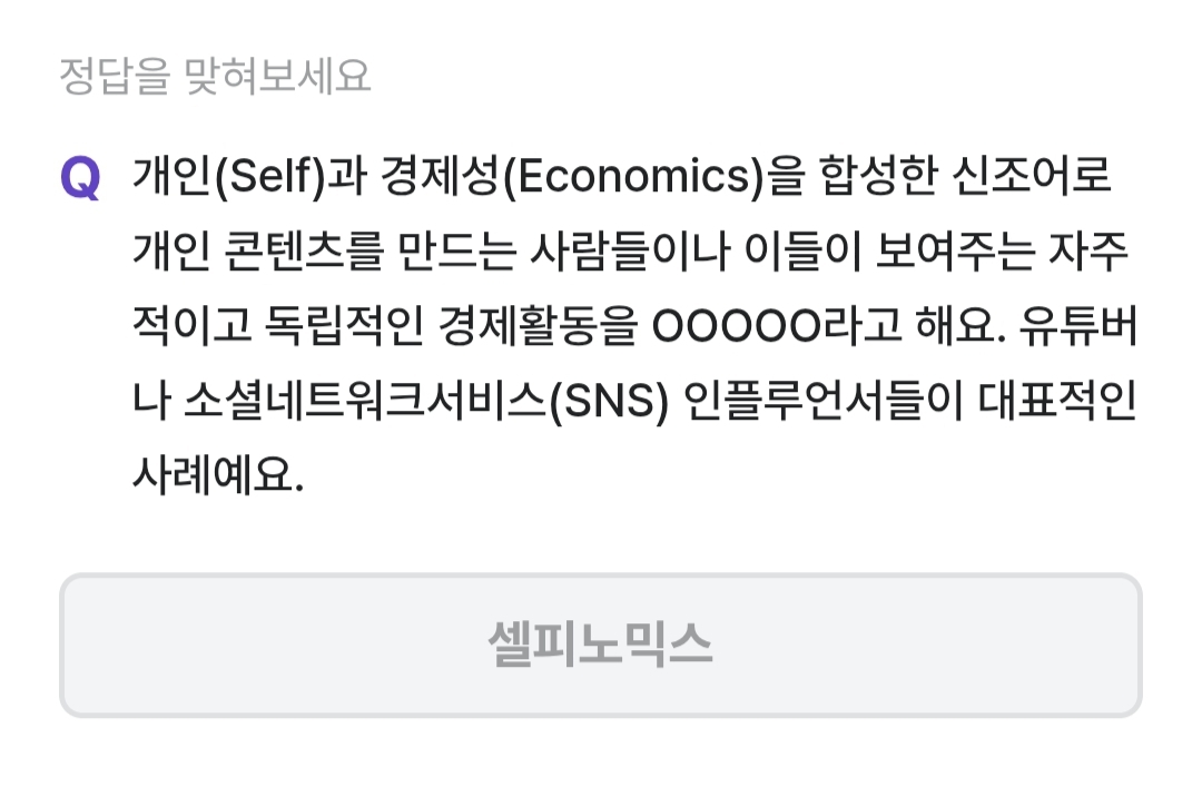 개인(Self) 과 경제성(Economics)를 합성한 신조어로 개인 콘텐츠를 만드는 사람들이나 이들이 보여주는 자주적이고 독립적인 경제활동을 무엇이라고 할까요?