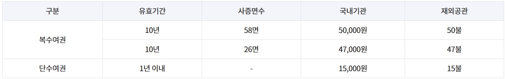 여권 발급비용은 18세 이상, 기간과 여권 장수에 따라 비용이 달라집니다. 전자여권 기준으로 18세 이상 성인의 경우 10년 이내 기준 26면이 5만 원, 58면이 53천 원입니다. 여행을 자주 가시는 분이라면 58면도 좋지만 10년 이내 26면도 괜찮을 것 같습니다.