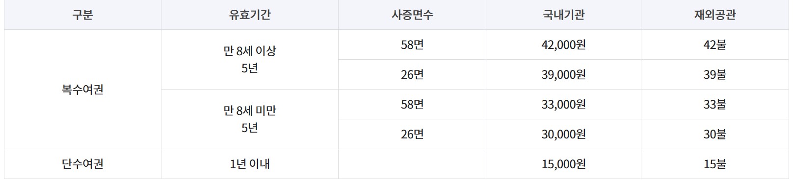 18세 미만인 경우도 만 8세 기준으로 나뉘어 여권 발급비용이 다름을 확인할 수 있습니다.