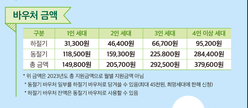 지원금액은 1년간 지원되는 금액으로 탄력적으로 사용이 가능한 장점이 있습니다. 겨울 바우처 일부를 여름 바우처로 당겨서 사용할 수 있고 여름 바우처 잔액이 남을 경우 겨울에 사용할 수 있습니다.